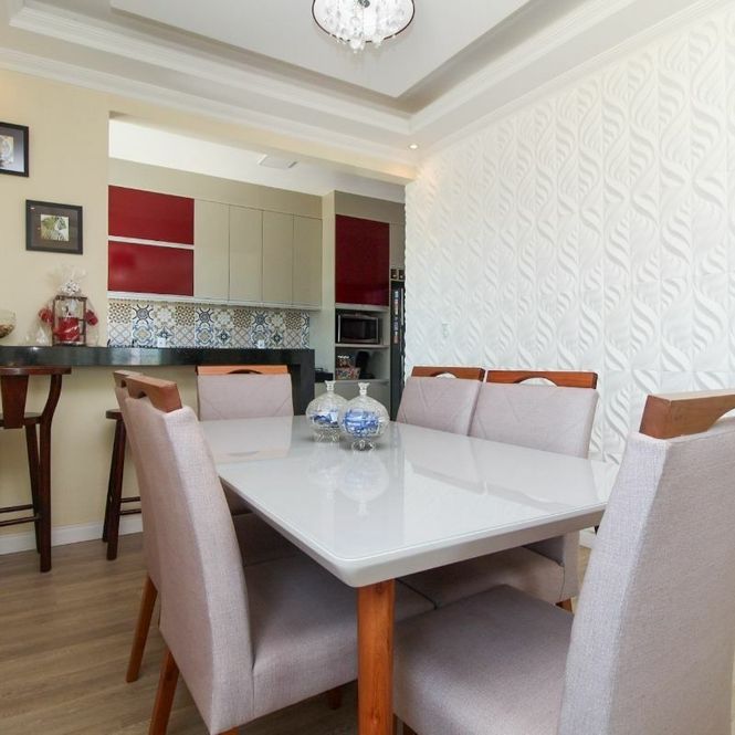 Composta por: 3 quartos, sendo uma suíte com guarda-roupa planejado, cozinha equipada, integrada a sala, sala para 2 ambientes, banheiro social.